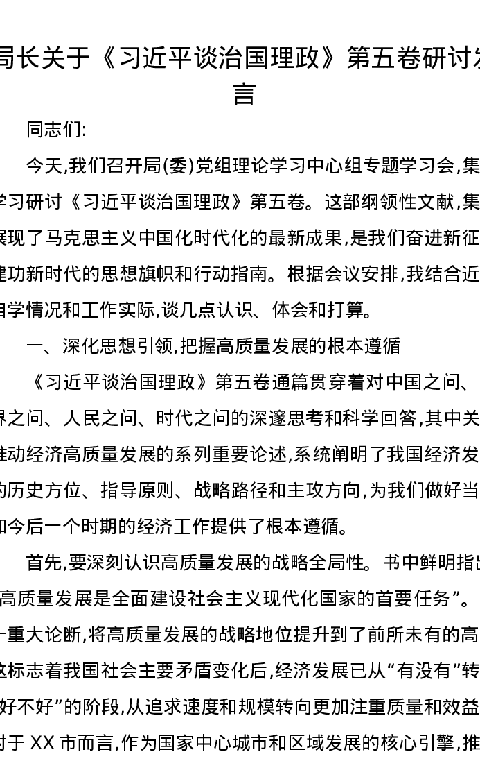 局长关于《习近平谈治国理政》第五卷研讨发言