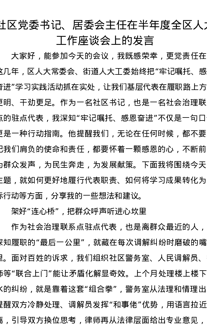 社区党委书记、居委会主任在半年度全区人大工作座谈会上的发言