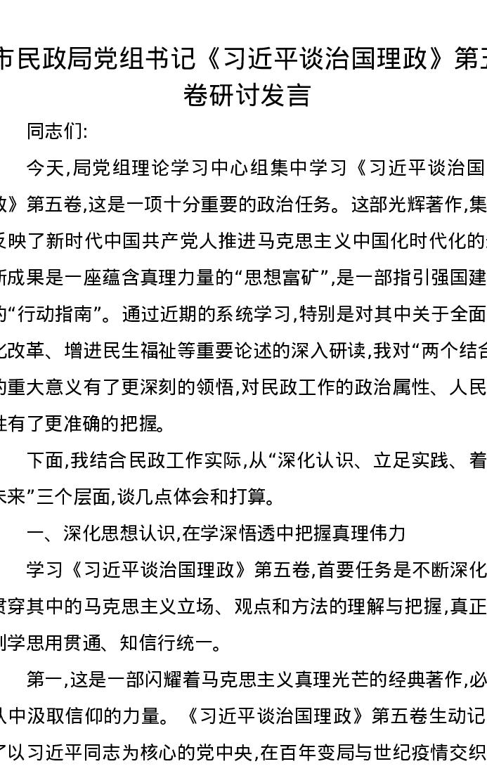 市民政局党组书记《习近平谈治国理政》第五卷研讨发言