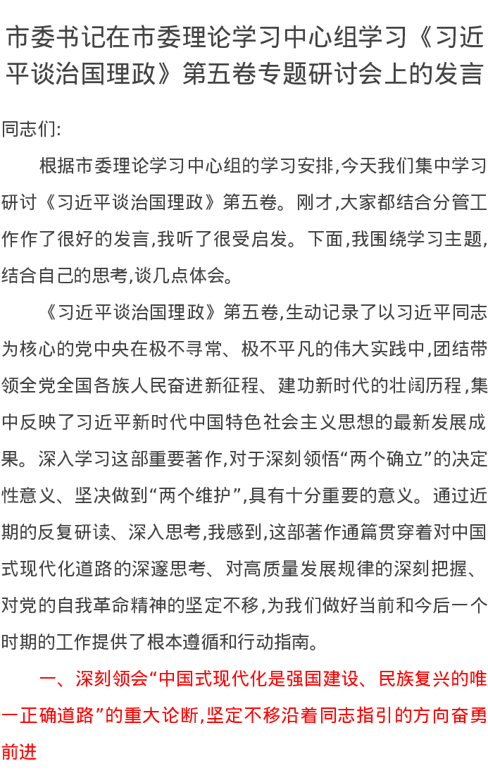 市委书记在市委理论学习中心组学习《习近平谈治国理政》第五卷专题研讨会上的发言
