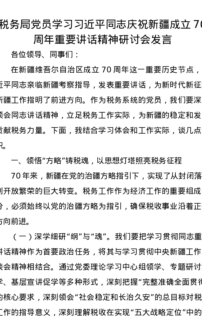 税务局党员学习习近平总书记庆祝新疆成立70周年重要讲话精神研讨会发言
