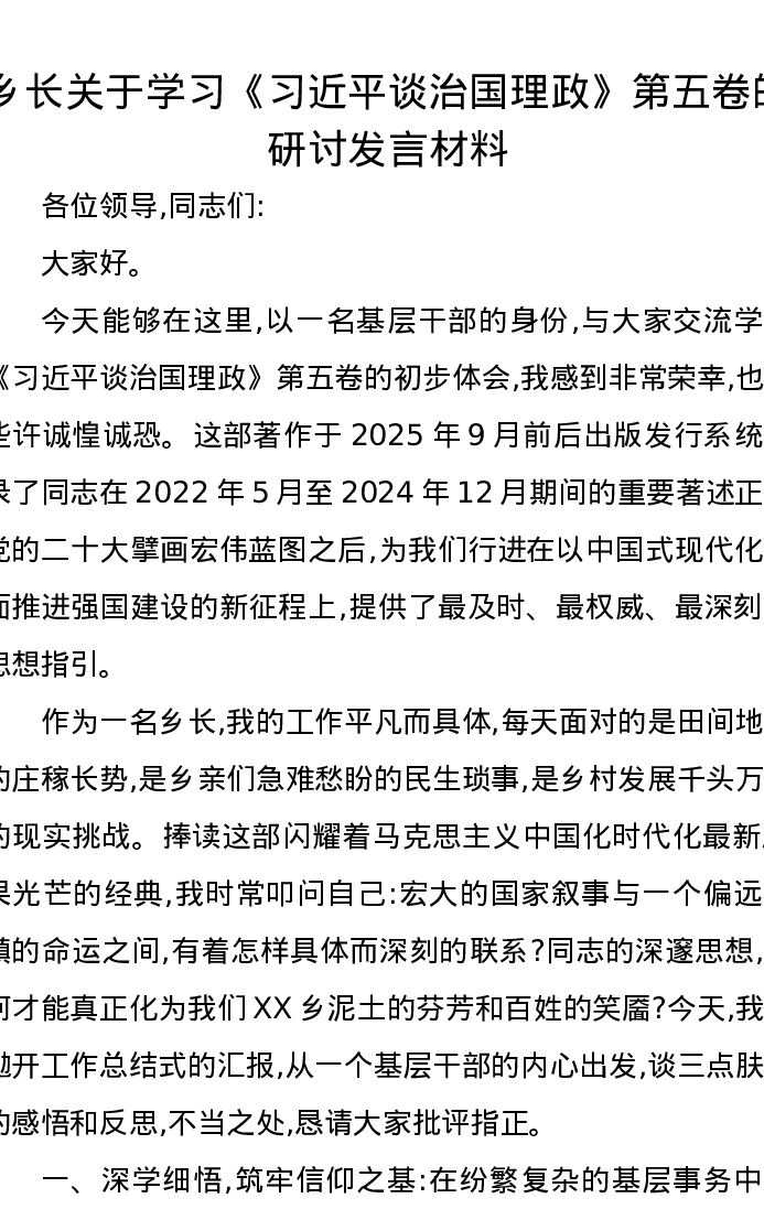乡长关于学习《习近平谈治国理政》第五卷的研讨发言材料