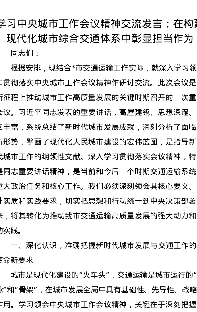 学习中央城市工作会议精神交流发言:在构建现代化城市综合交通体系中彰显担当作为