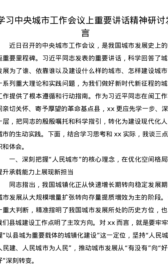学习中央城市工作会议上重要讲话精神研讨发言