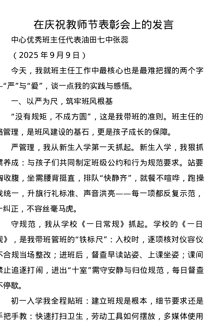 优秀班主任代表在庆祝教师节表彰会上的发言