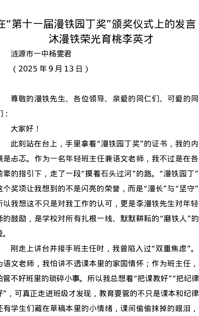 在“第十一届漫铁园丁奖”颁奖仪式上的发言:沐漫铁荣光育桃李英才