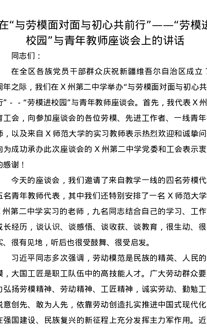 在“与劳模面对面与初心共前行”——“劳模进校园”与青年教师座谈会上的讲话