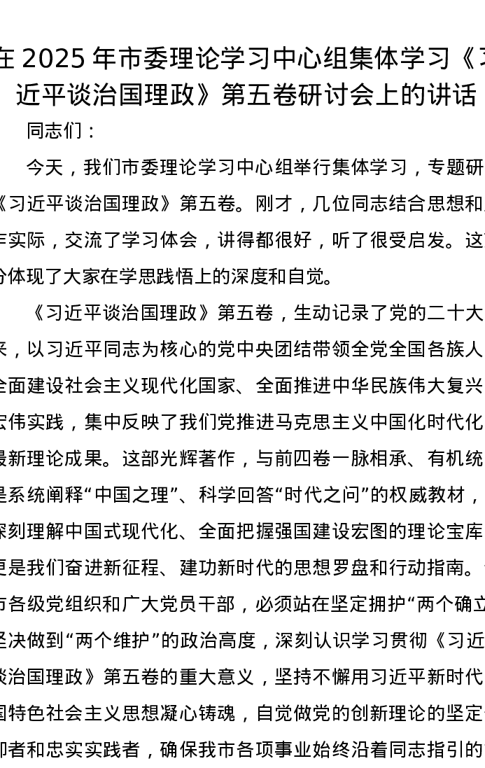 在2025年市委理论学习中心组集体学习《习近平谈治国理政》第五卷研讨会上的讲话