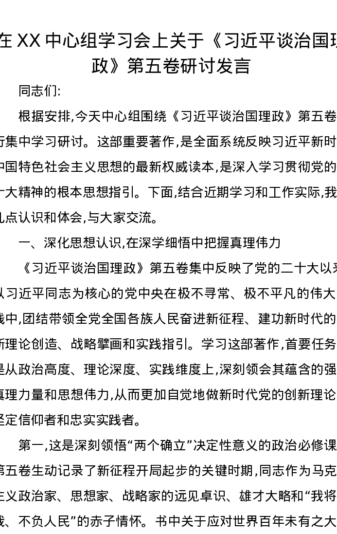 在XX中心组学习会上关于《习近平谈治国理政》第五卷研讨发言
