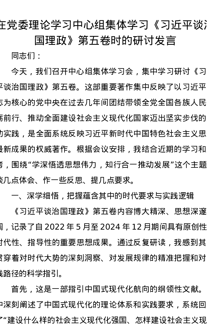 在党委理论学习中心组集体学习《习近平谈治国理政》第五卷时的研讨发言