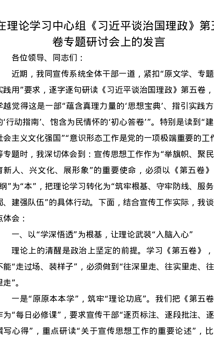 在理论学习中心组《习近平谈治国理政》第五卷专题研讨会上的发言