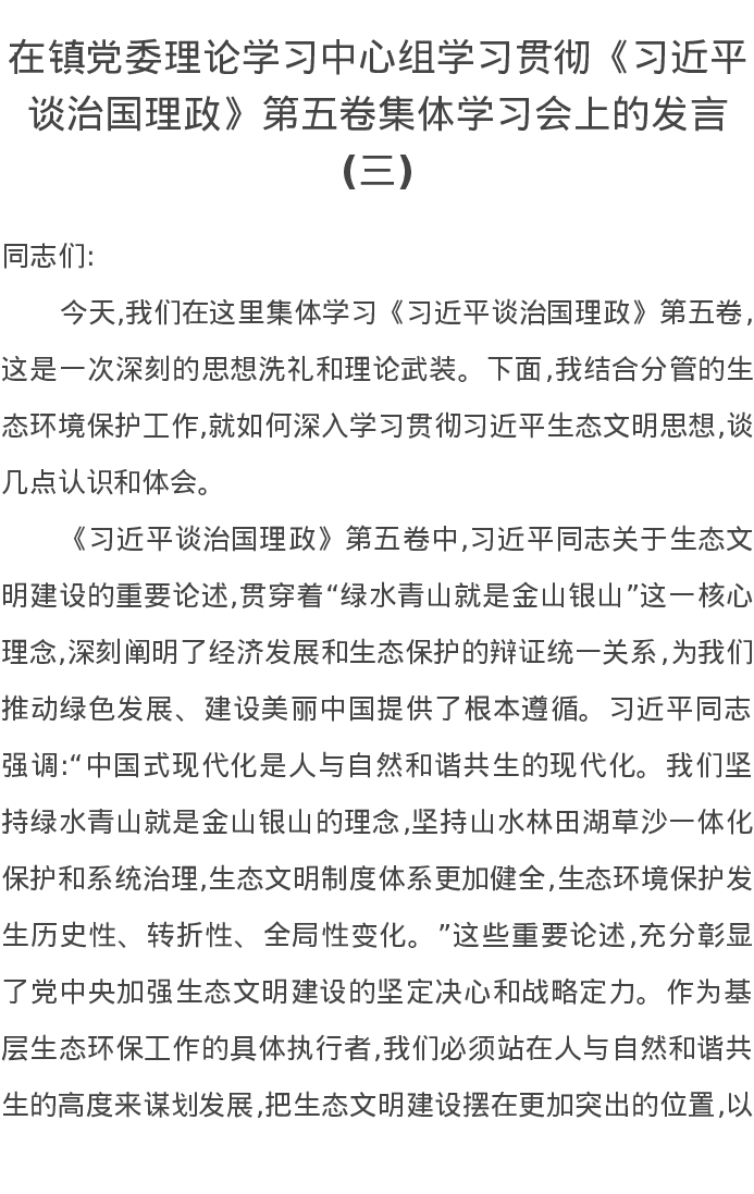 在镇党委理论学习中心组学习贯彻《习近平谈治国理政》第五卷集体学习会上的发言(三)