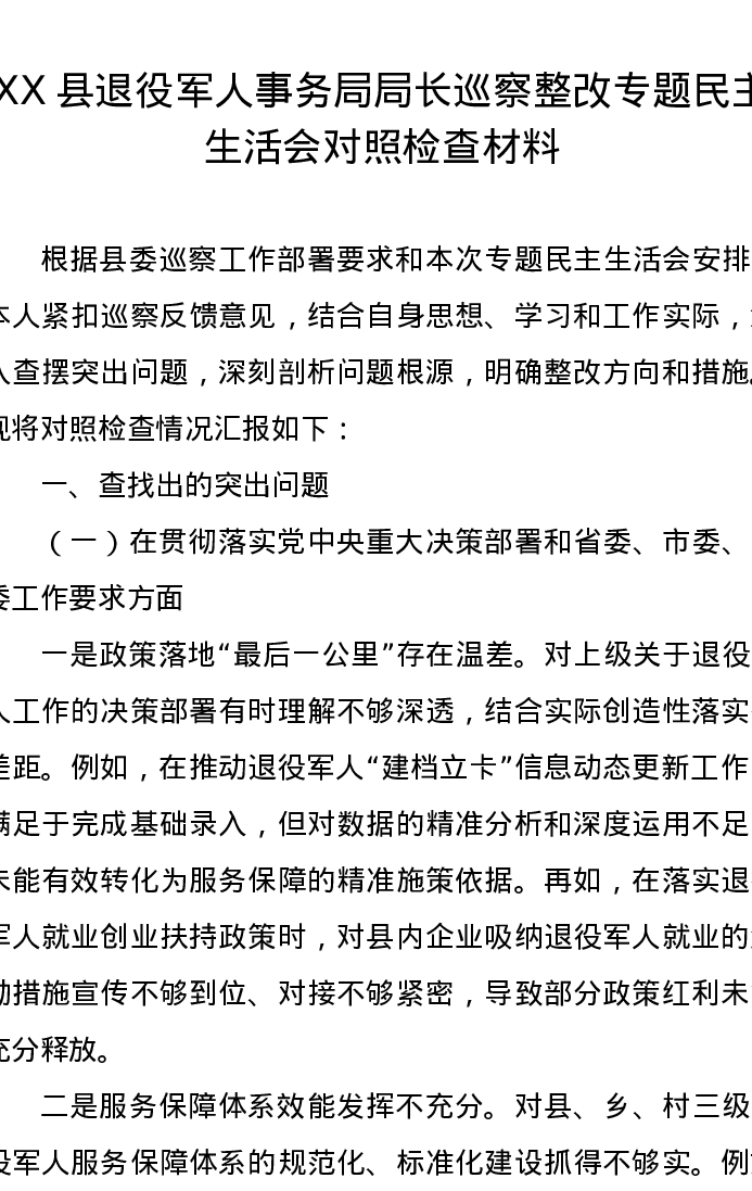 XX县退役军人事务局局长巡察整改专题民主生活会对照检查材料