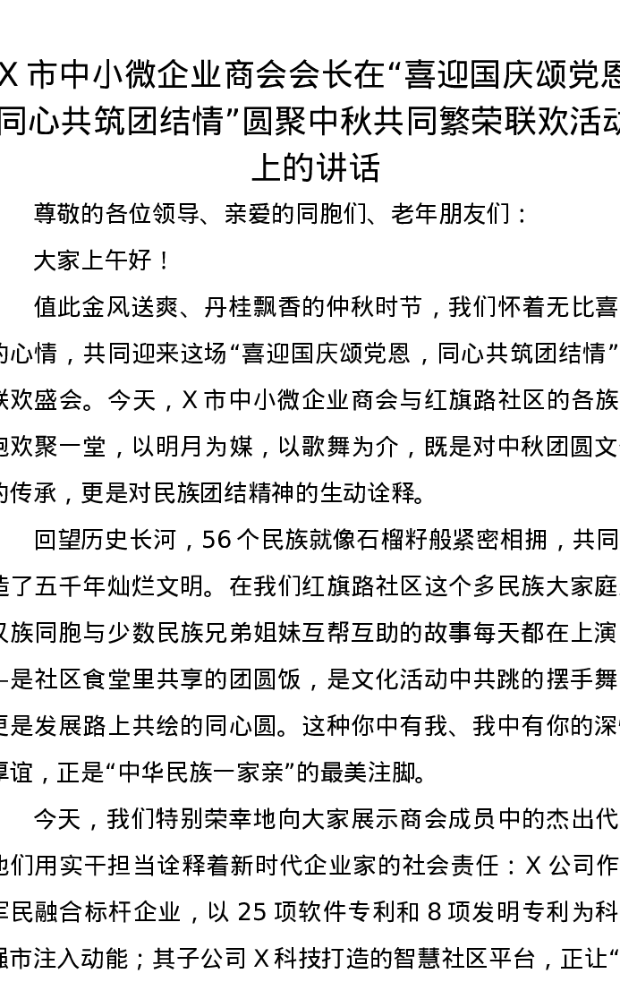 X市中小微企业商会会长在“喜迎国庆颂党恩,同心共筑团结情”圆聚中秋共同繁荣联欢活动上的讲话