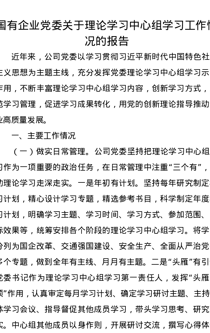 国有企业党委关于理论学习中心组学习工作情况的报告