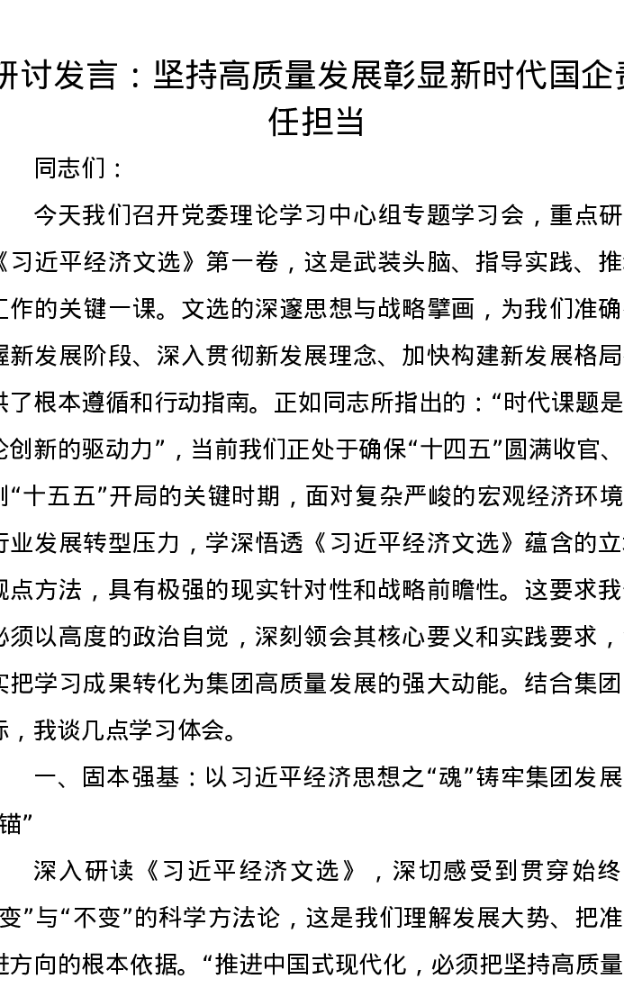研讨发言:坚持高质量发展 彰显新时代国企责任担当