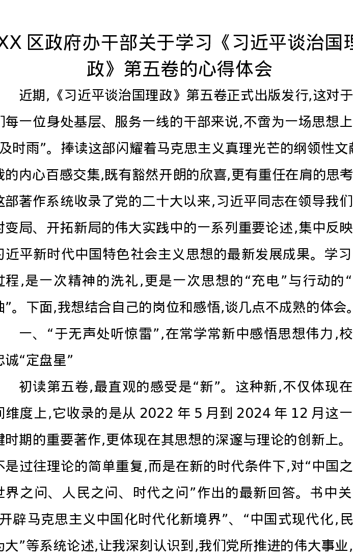 XX区政府办干部关于学习《习近平谈治国理政》第五卷的心得体会