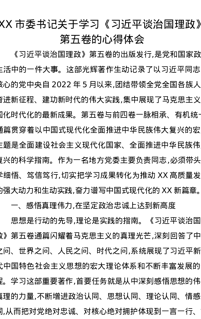 XX市委书记关于学习《习近平谈治国理政》第五卷的心得体会