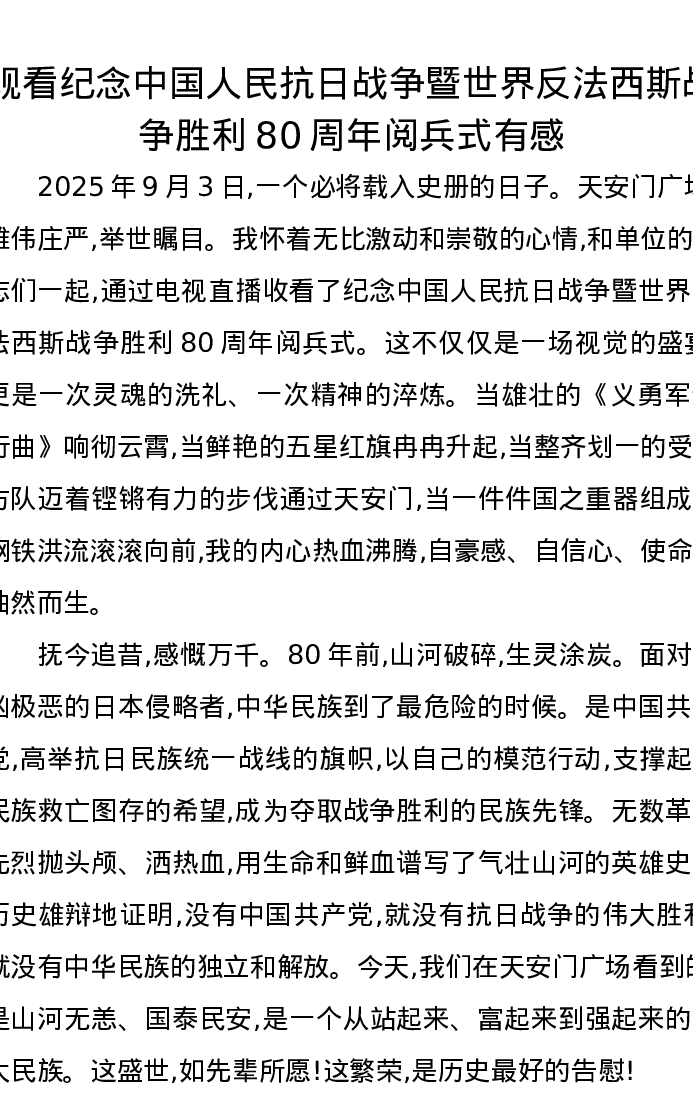 观看纪念中国人民抗日战争暨世界反法西斯战争胜利80周年阅兵式有感心得体会