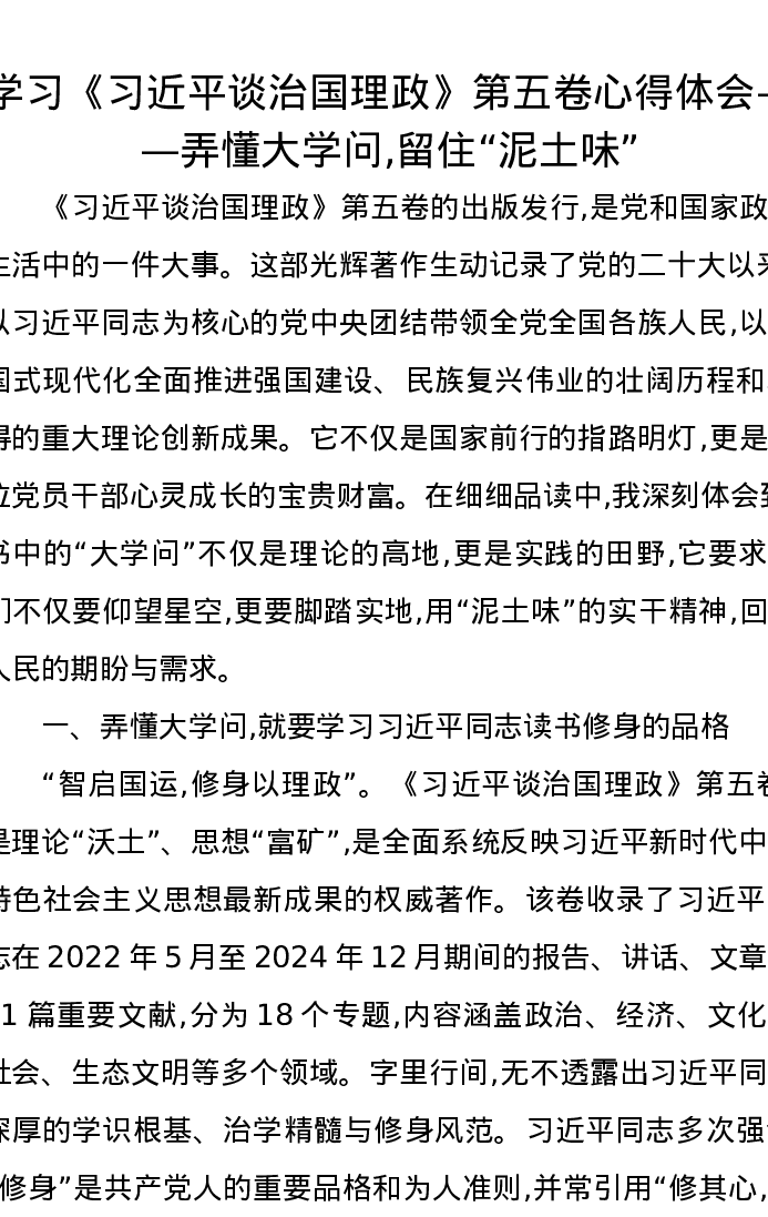 学习《习近平谈治国理政》第五卷心得体会——弄懂大学问,留住“泥土味”