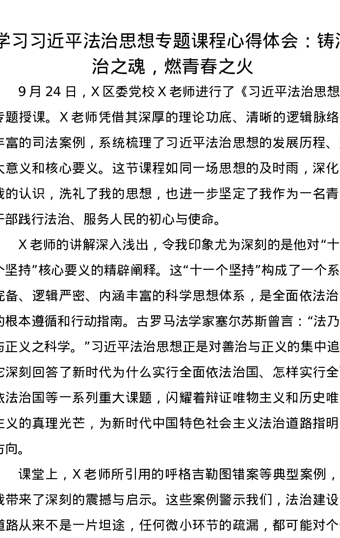 学习习近平法治思想专题课程心得体会:铸法治之魂,燃青春之火