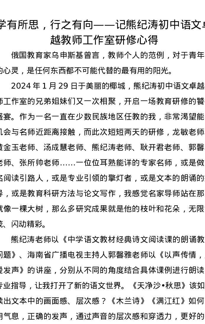 学有所思,行之有向——记熊纪涛初中语文卓越教师工作室研修心得