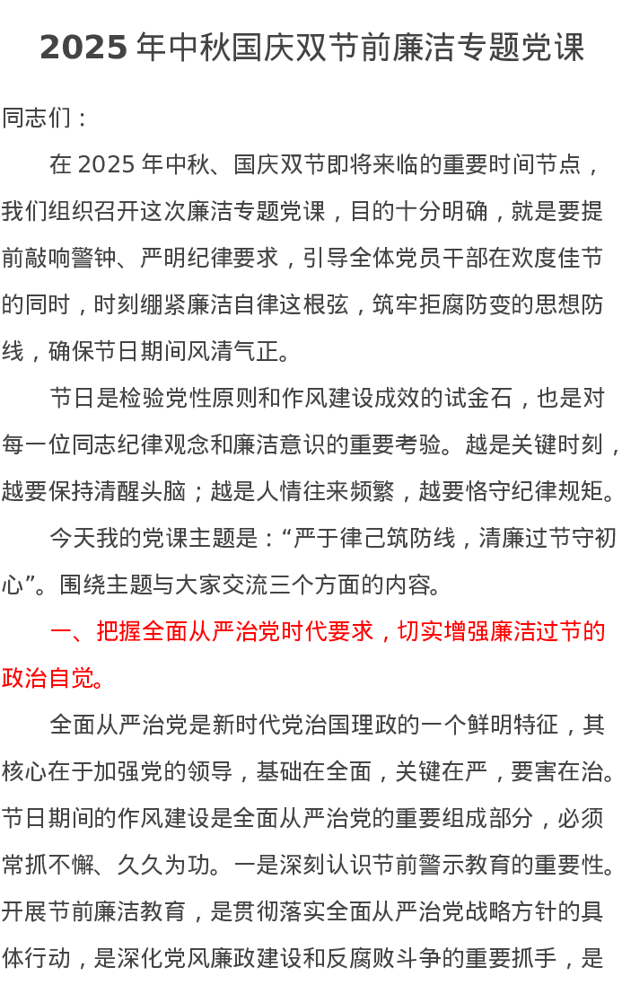 2025年中秋国庆双节前廉洁专题党课讲稿