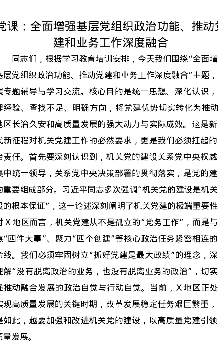 党课讲稿:全面增强基层党组织政治功能、推动党建和业务工作深度融合