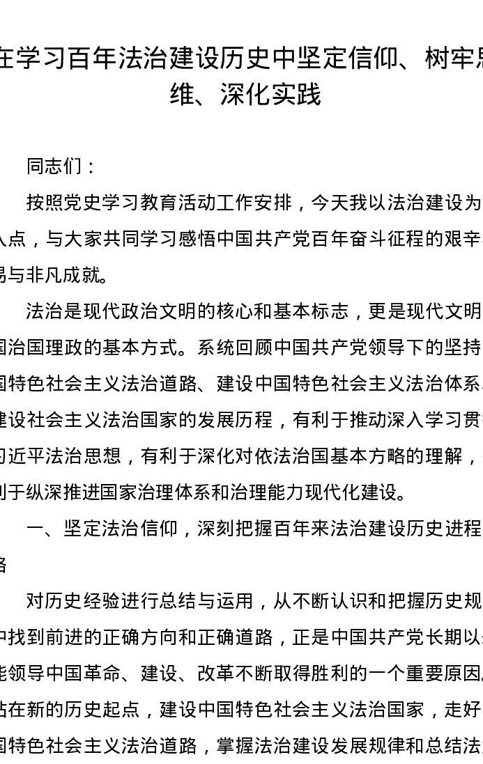 党课讲稿:在学习百年法治建设历史中坚定信仰、树牢思维、深化实践