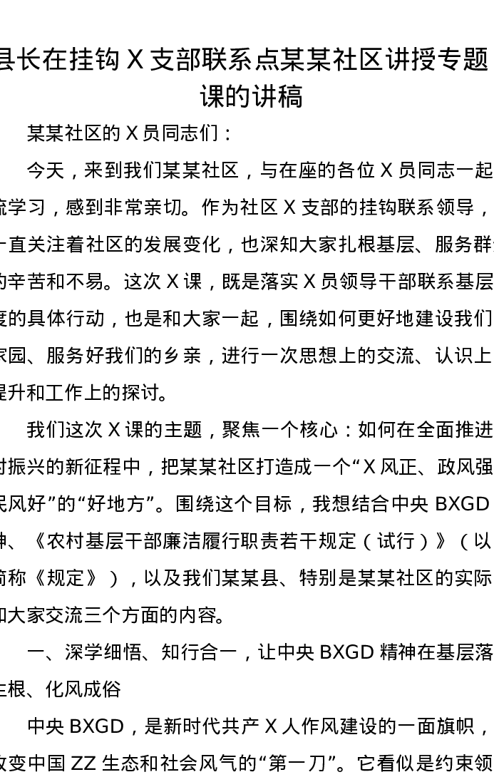 县长在挂钩党支部联系点某某社区讲授专题党课的讲稿