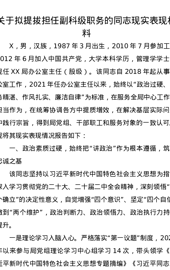 关于拟提拔担任副科级职务的同志现实表现材料