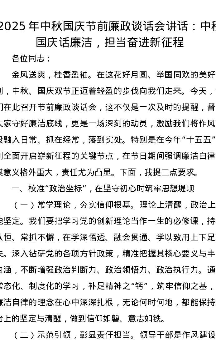 2025年中秋国庆节前廉政谈话会讲话:中秋国庆话廉洁,担当奋进新征程