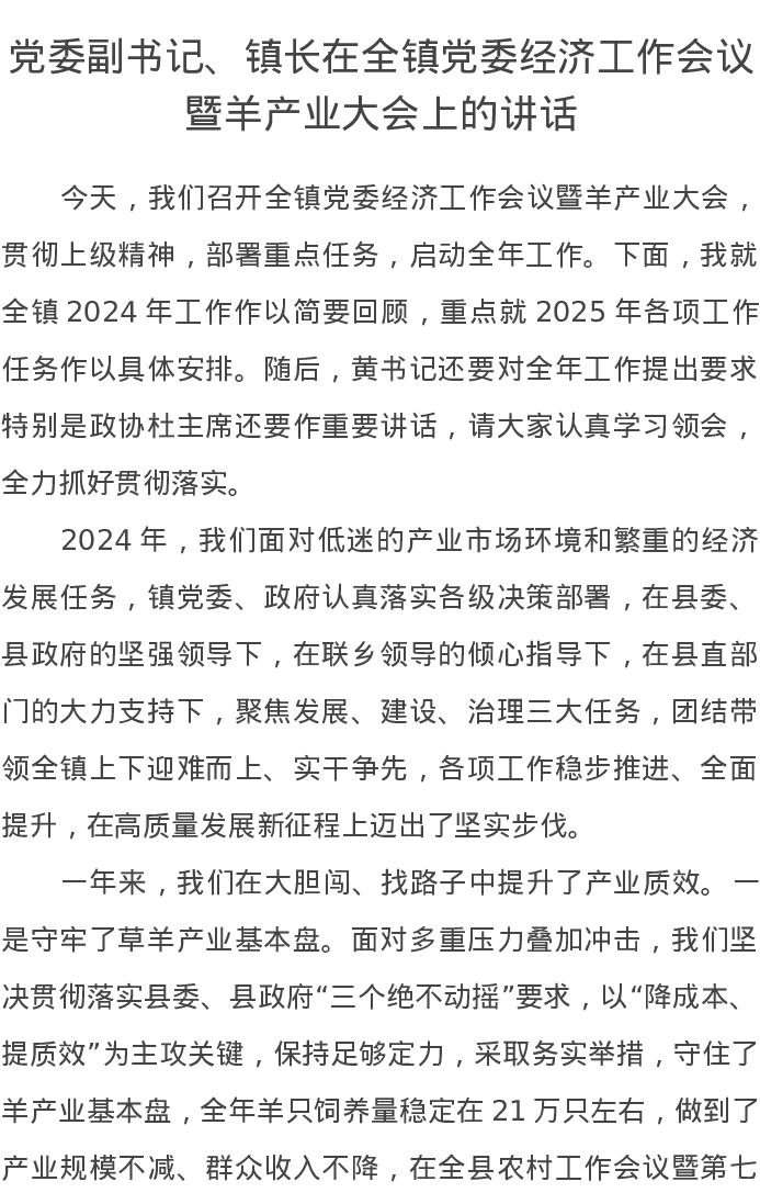 党委副书记、镇长在全镇党委经济工作会议暨羊产业大会上的讲话