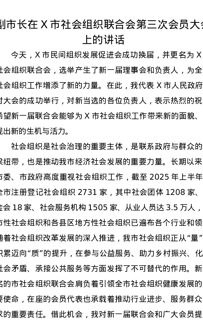 副市长在X市社会组织联合会第三次会员大会上的讲话