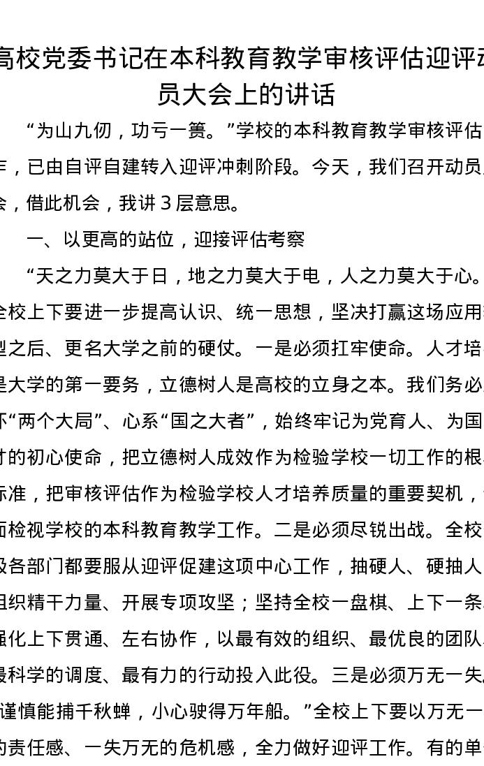 高校党委书记在本科教育教学审核评估迎评动员大会上的讲话