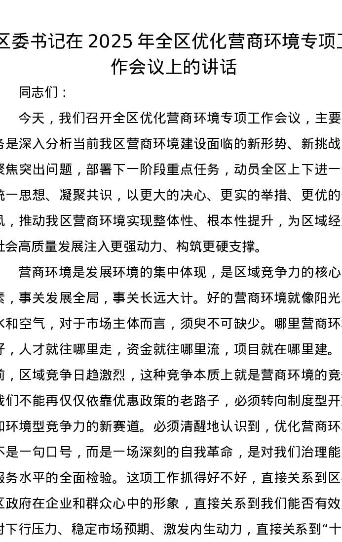 区委书记在2025年全区优化营商环境专项工作会议上的讲话