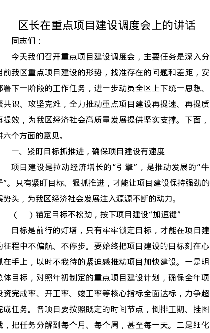 区长在重点项目建设调度会上的讲话