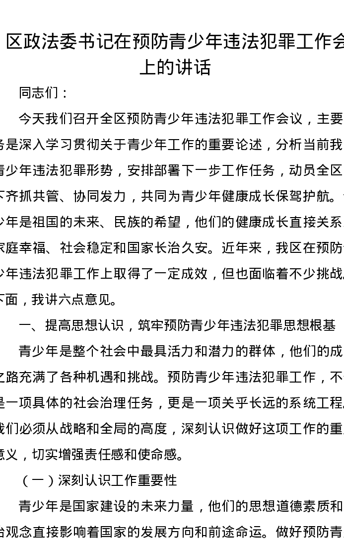 区政法委书记在预防青少年违法犯罪工作会上的讲话