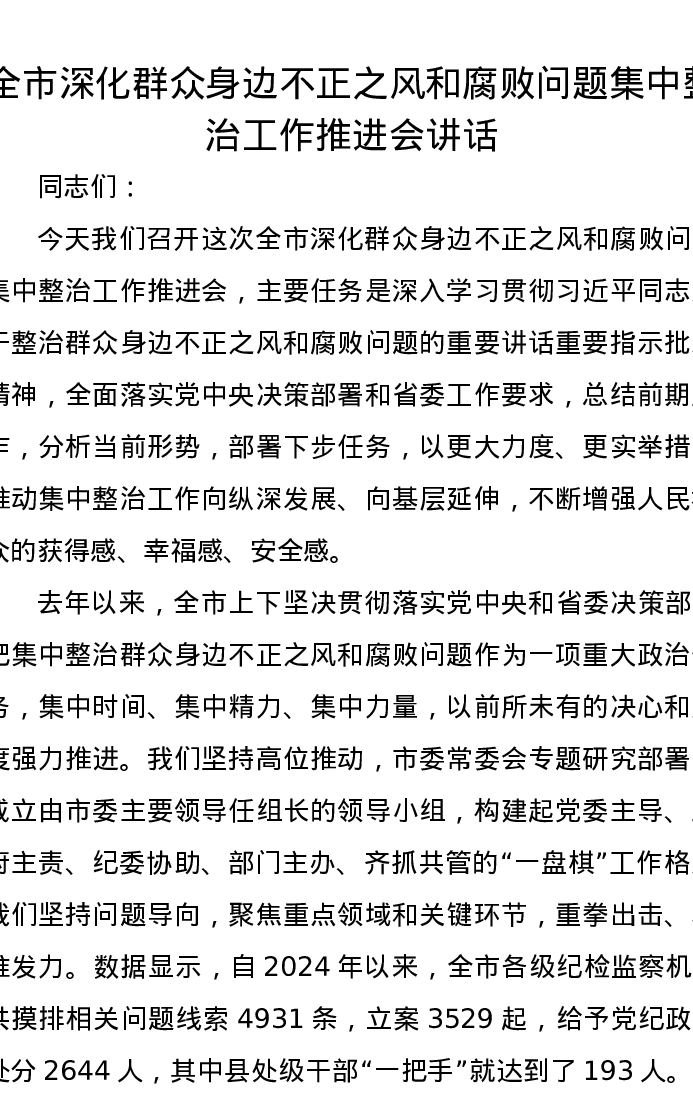 全市深化群众身边不正之风和腐败问题集中整治工作推进会讲话