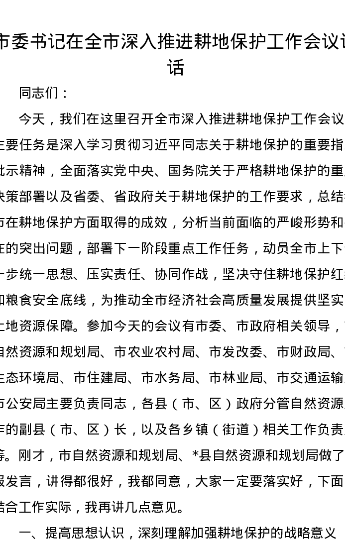 市委书记在全市深入推进耕地保护工作会议讲话