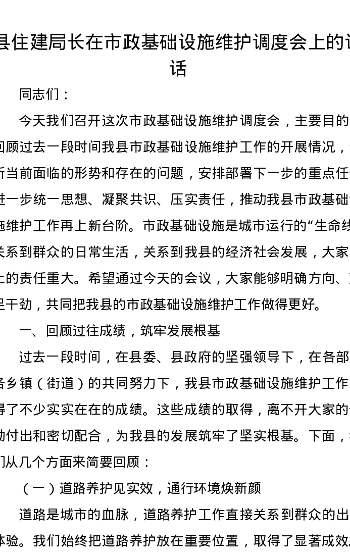 县住建局长在市政基础设施维护调度会上的讲话
