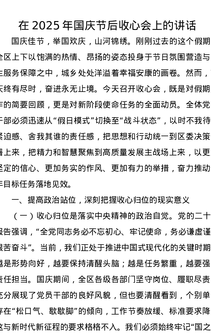 在2025年国庆节后收心会上的讲话