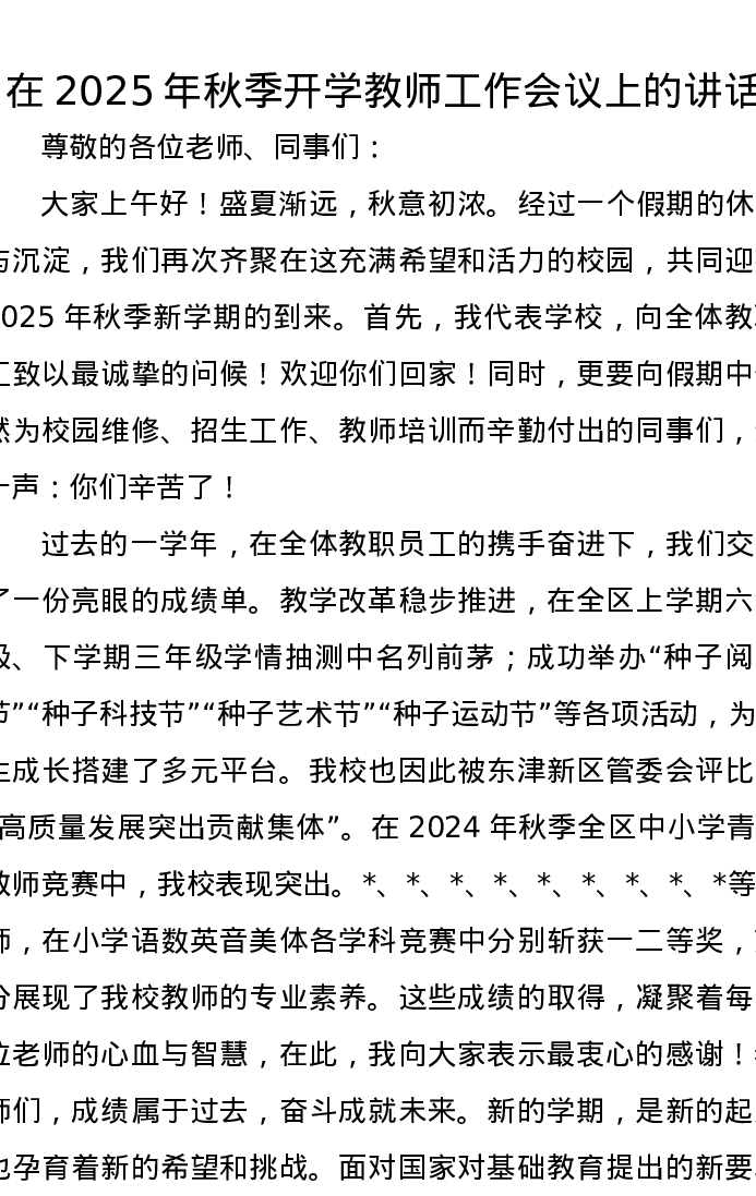 在2025年秋季开学教师工作会议上的讲话