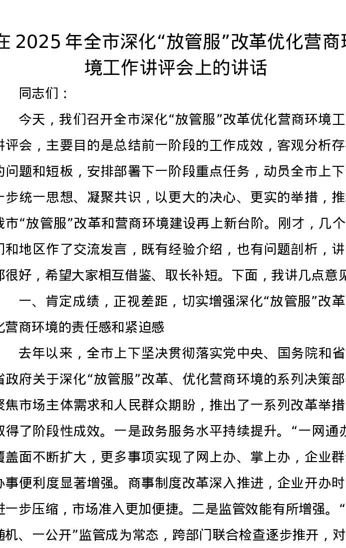 在2025年全市深化“放管服”改革优化营商环境工作讲评会上的讲话