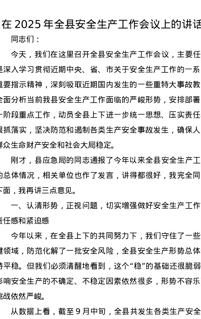 在2025年全县安全生产工作会议上的讲话