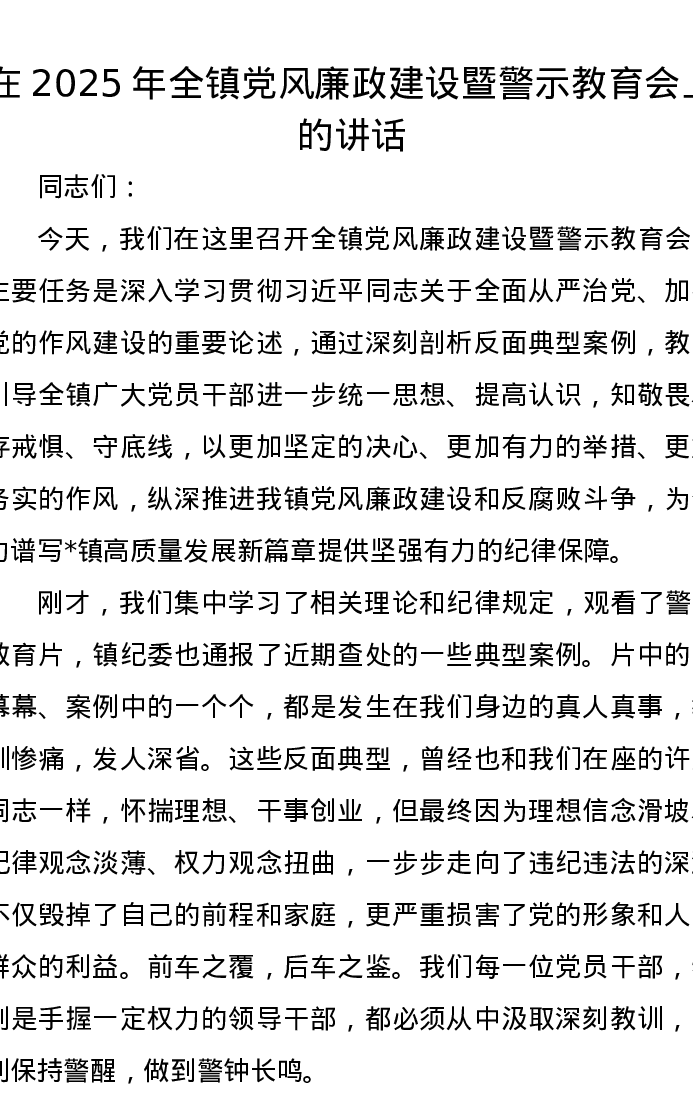 在2025年全镇党风廉政建设暨警示教育会上的讲话