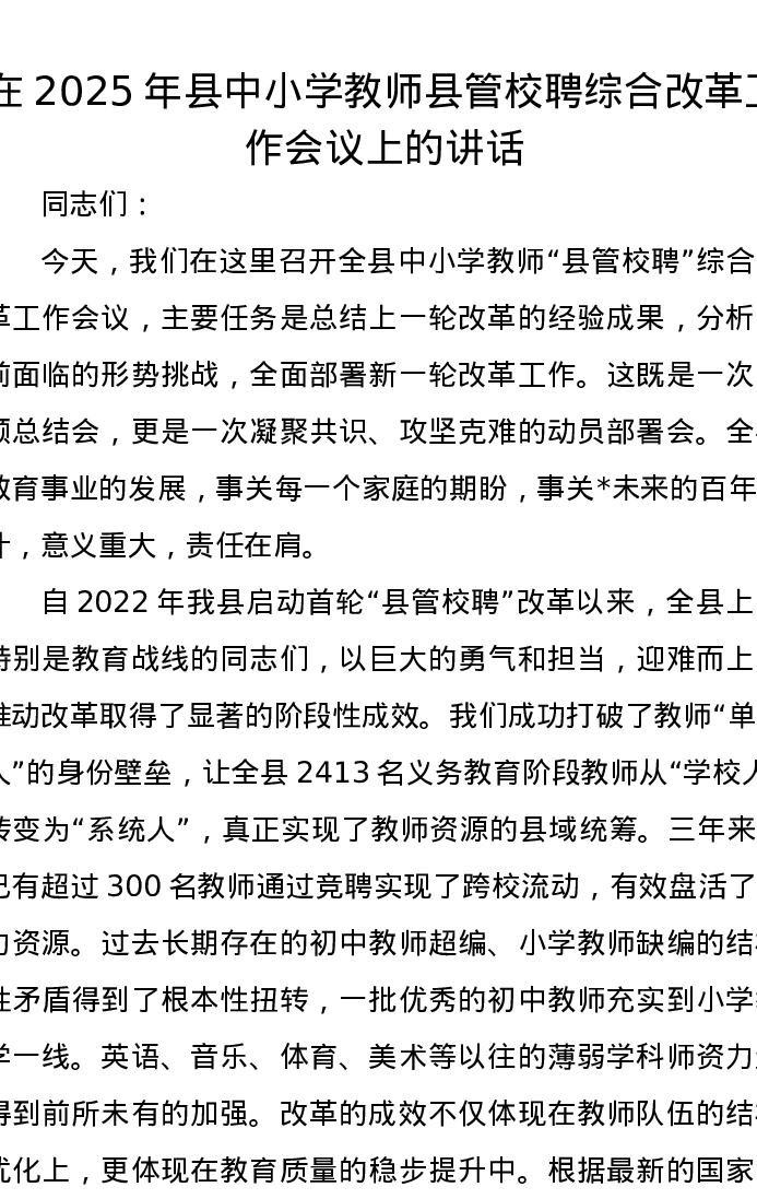 在2025年县中小学教师县管校聘综合改革工作会议上的讲话