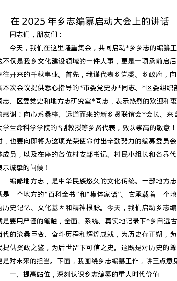 在2025年乡志编纂启动大会上的讲话