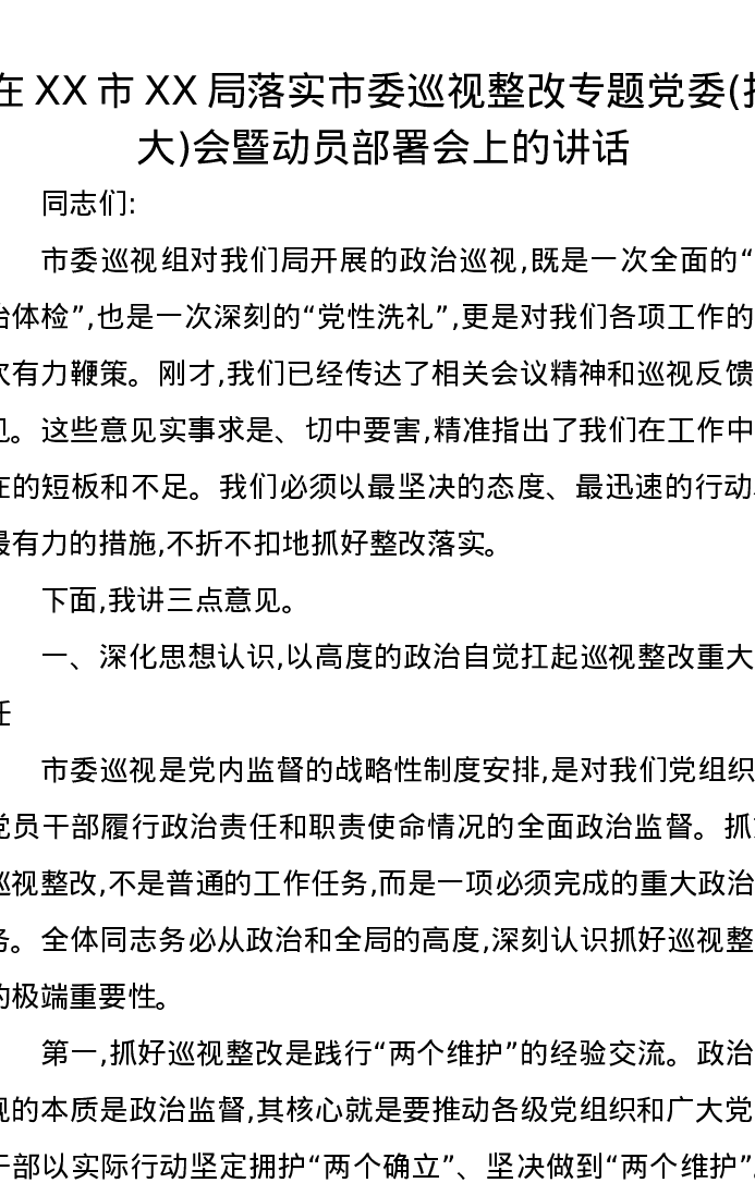 在XX市XX局落实市委巡视整改专题党委(扩大)会暨动员部署会上的讲话