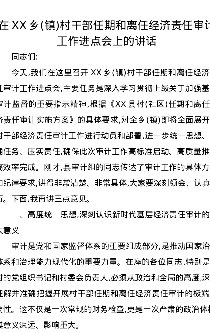 在XX乡(镇)村干部任期和离任经济责任审计工作进点会上的讲话